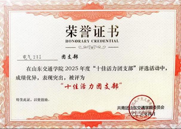4月22日,山东交通学院2025年度“十佳活力团支部”评选比赛圆满落幕,我院电气231团支部凭借扎实的组织建设、突出的学业科创成果、深厚的实践担当,在众多参赛支部中脱颖而出,成功斩获评选第一名,用青春实绩彰显基层团支部的先锋力量,为学院共青团工作再添荣光。