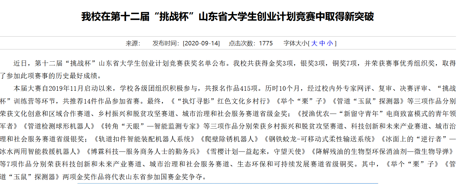 1.29第十二届“挑战杯”山东省大学生创业计划铜奖